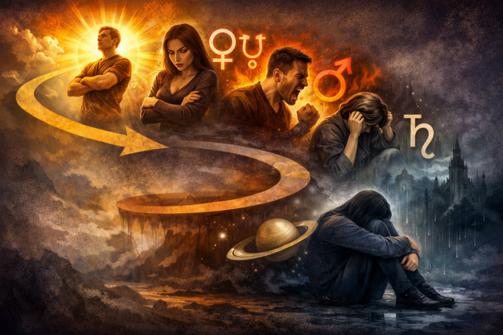 - Λύπη (Sadness) – Στον πυθμένα της πτώσης βρίσκεται η βαθιά λύπη ή θλίψη. Αφού το άτομο πάλεψε με θυμό και φόβο, συχνά έρχεται αντιμέτωπο με την πραγματικότητα της απώλειας: απώλεια αυταπάτης, απώλεια σχέσεων ή στόχων, ή απώλεια της εικόνας που είχε για τον εαυτό του. Αυτή η λύπη δεν είναι επιφανειακή αλλά υπαρξιακή – συνοδεύεται από αίσθημα κενού και ματαιότητας. Είναι το στάδιο της υπαρξιακής απόγνωσης, όπου η ζωή μοιάζει να έχει χάσει το χρώμα και το νόημά της. Αστρολογικά, και πάλι ο Κρόνος είναι ο κύριος δείκτης: η «κατάθλιψη» είναι ένα γνωστό γνώρισμα του Κρόνου. Οι παραδοσιακοί αστρολόγοι περιέγραφαν τον άνθρωπο υπό την επιρροή του Κρόνου ως μελαγχολικό τύπο – βαρύθυμο, απαισιόδοξο, γεμάτο σκοτούρες. Ένας άλλος συντελεστής της θλίψης μπορεί να είναι και ο Ποσειδώνας (και ο 12ος οίκος/Ιχθύς): ο Ποσειδώνας διαλύει τα σύνορα και φέρνει μια διάχυτη θλίψη, συχνά χωρίς σαφή αιτία, μια νοσταλγία ή απογοήτευση από την ζωή. Ωστόσο, ο Κρόνος ενσαρκώνει πιο έντονα εκείνη την ψυχρή, σκοτεινή νύχτα της ψυχής που βιώνει κανείς στην απόγνωση. Είναι αξιοσημείωτο ότι πολλοί άνθρωποι βιώνουν τέτοιες περιόδους κατά την Επιστροφή του Κρόνου (~29-30 ετών ή ~58-60 ετών), όταν ο πλανήτης αυτός επιστρέφει στη γενέθλια θέση του – συχνά τότε αντιμετωπίζουμε υπαρξιακά ερωτήματα, αισθήματα μοναξιάς ή ματαίωσης. Στο στάδιο της λύπης, το άτομο μπορεί να νιώθει αβοήθητο. Όμως ακριβώς μέσα σε αυτή τη σκοτεινή νύχτα αρχίζει να διαφαίνεται η ανάγκη για αλλαγή – η αναζήτηση ενός φωτός.
